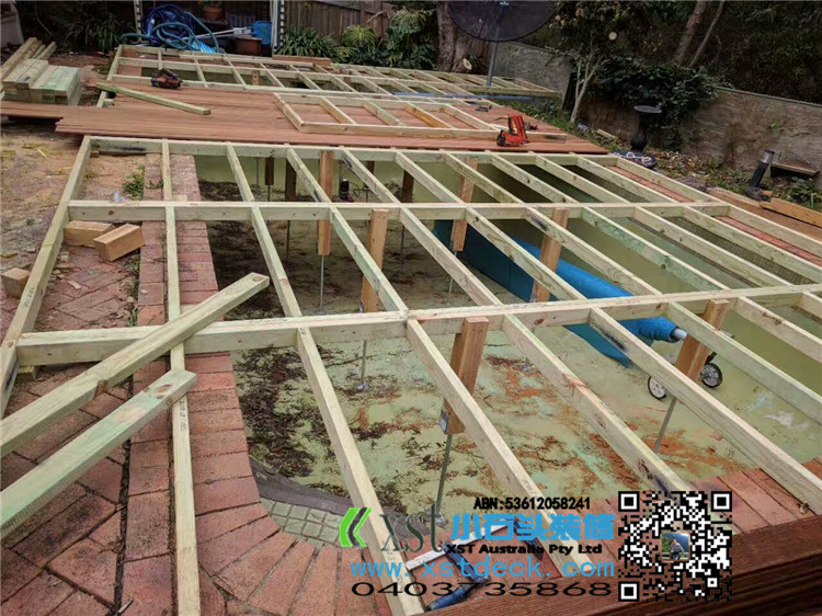 Melbourne outdoor swimming pool outdoor platform floor merbau decking 120 flat shaped iron feet overhead.