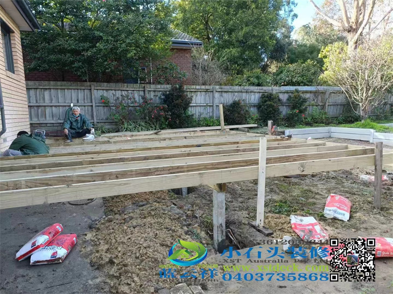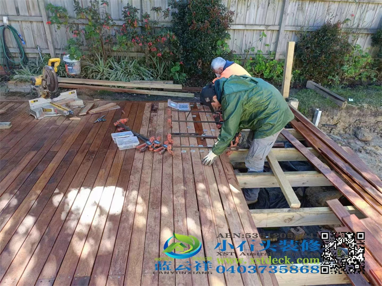 Melbourne with license 190x45 anti-corrosion treated wood bottom frame, cement top post, outdoor floor merbau 90x19 Outsourcing edge 45 degree angle, the gap between each board is treated with 4~5mm.