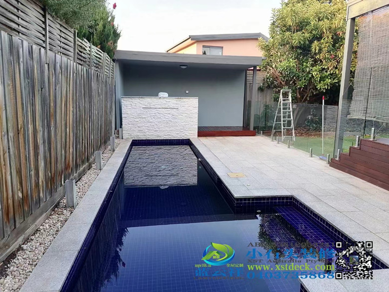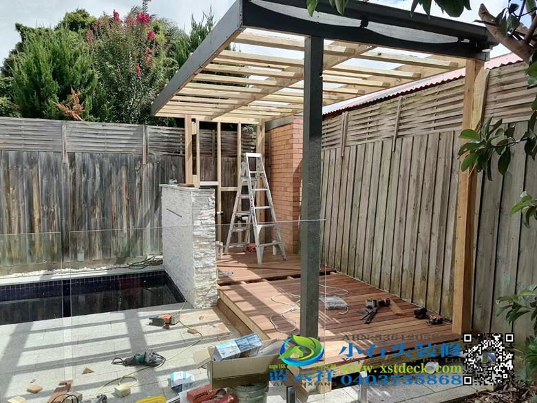 Merbau 90X19 decking on the edge of swimming pool in Melbourne, Australia, outdoor floor. Pergola pergola, ceiling wall.