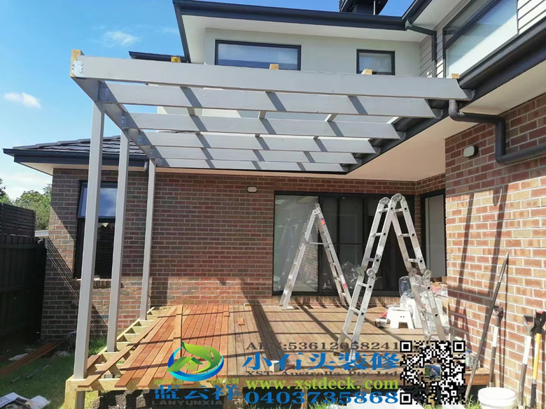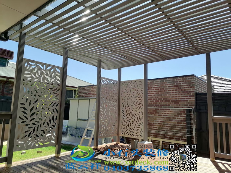 Melbourne flat-top pergola, screen, the top hollowed out wooden strips fall off the roof.