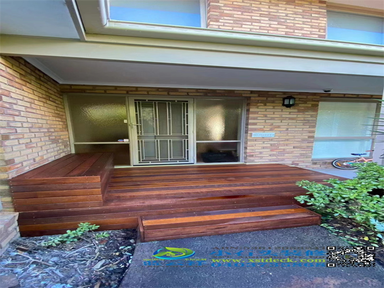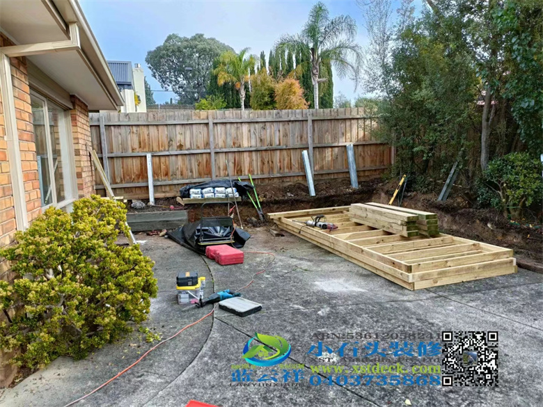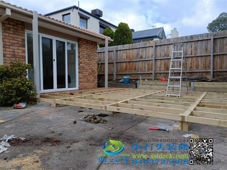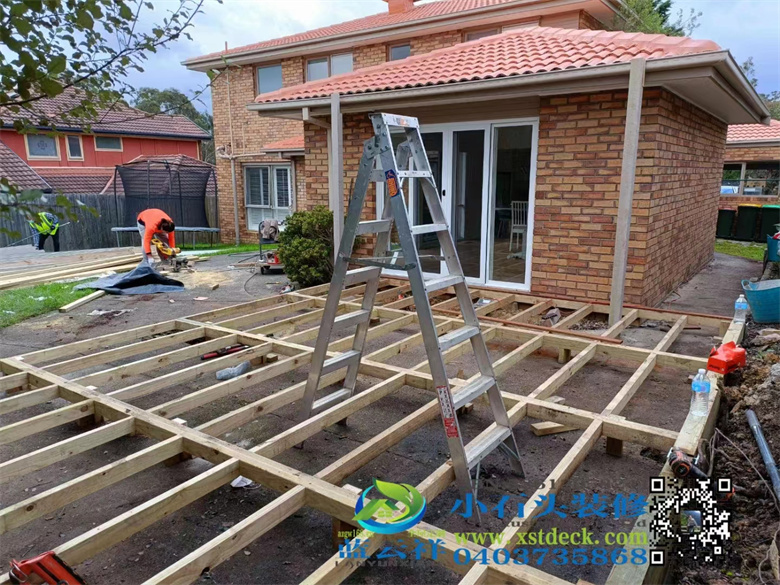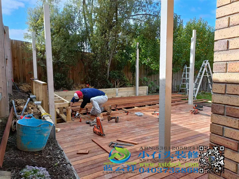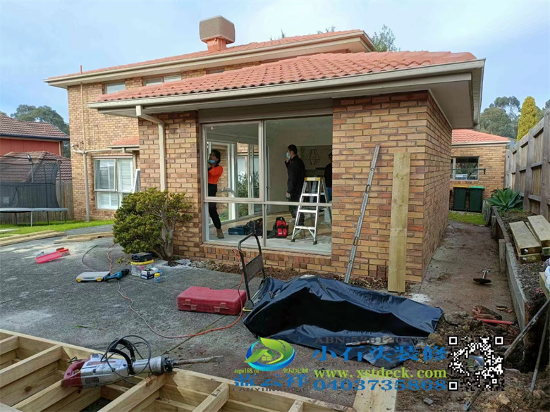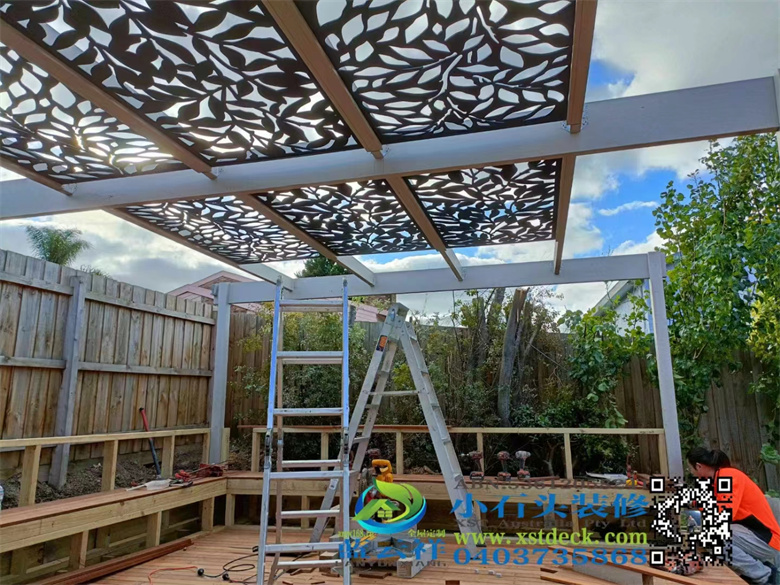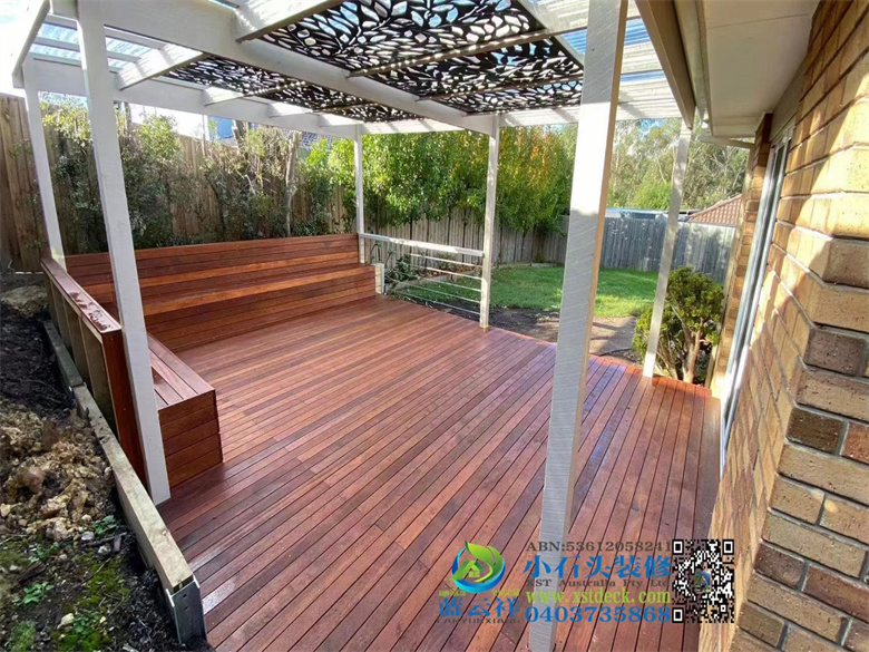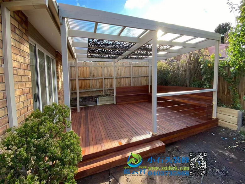 墨尔本后院改造,90x19面板,户外实木地板,H钢75 mm档木墙,凉棚,雨棚,屏封顶部装饰,木门窗改双开铝合金移门 ,不锈钢钢丝护手围栏,带靠背户外凳子