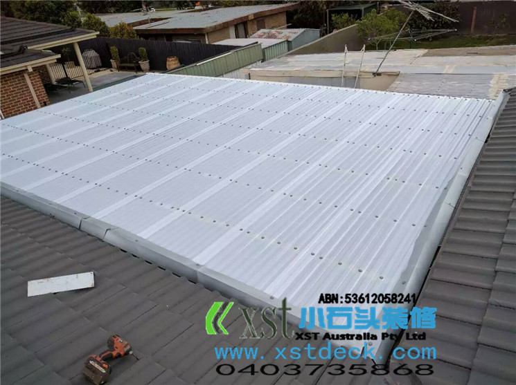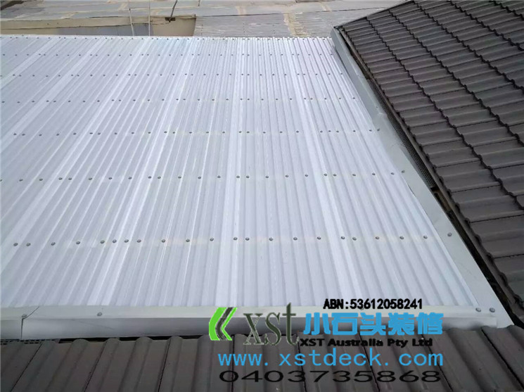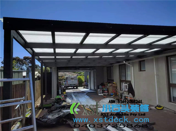 墨尔本 pergola carport 38平方5米跨度车棚。三面L型铁皮包边,防漏水,全油漆,水槽