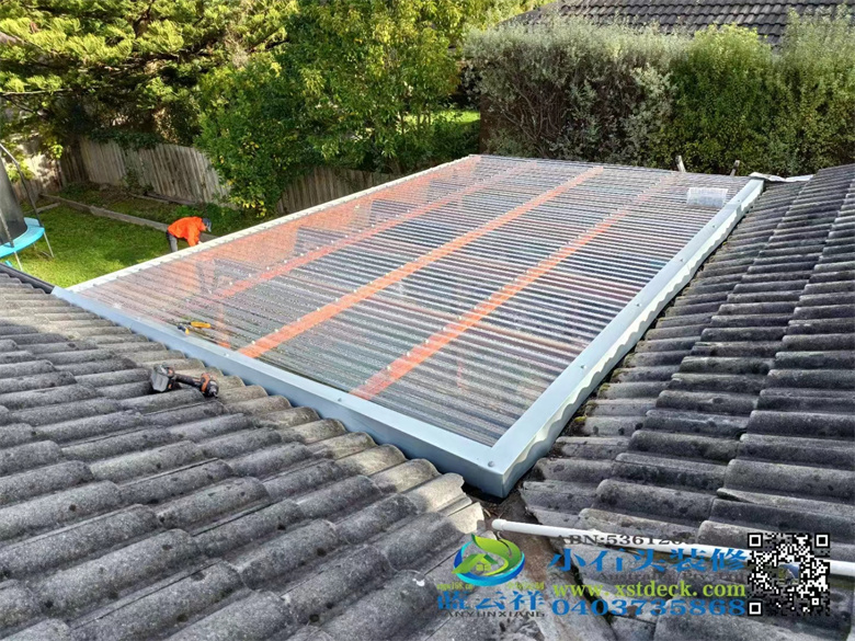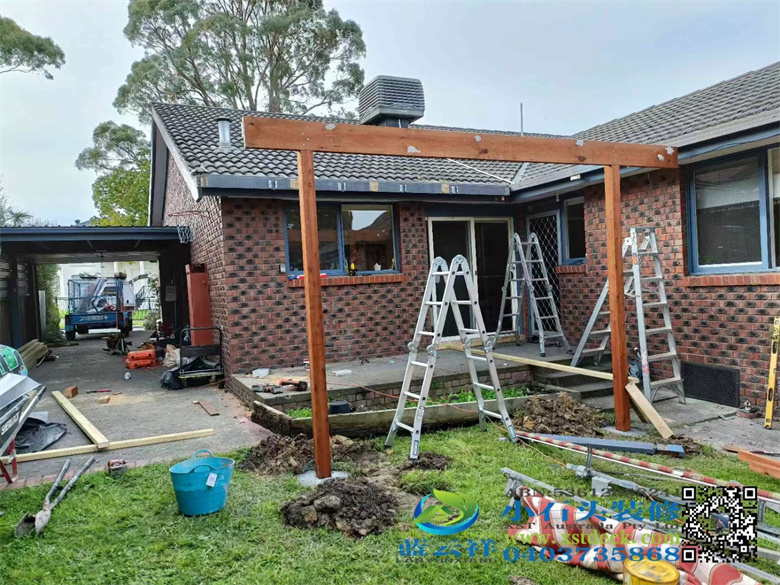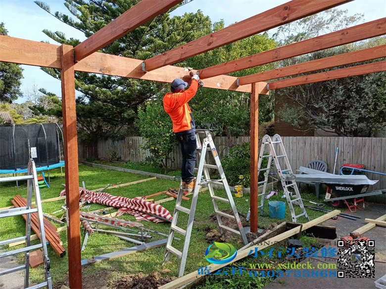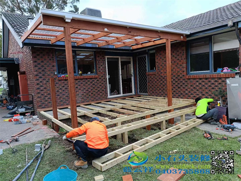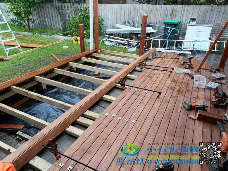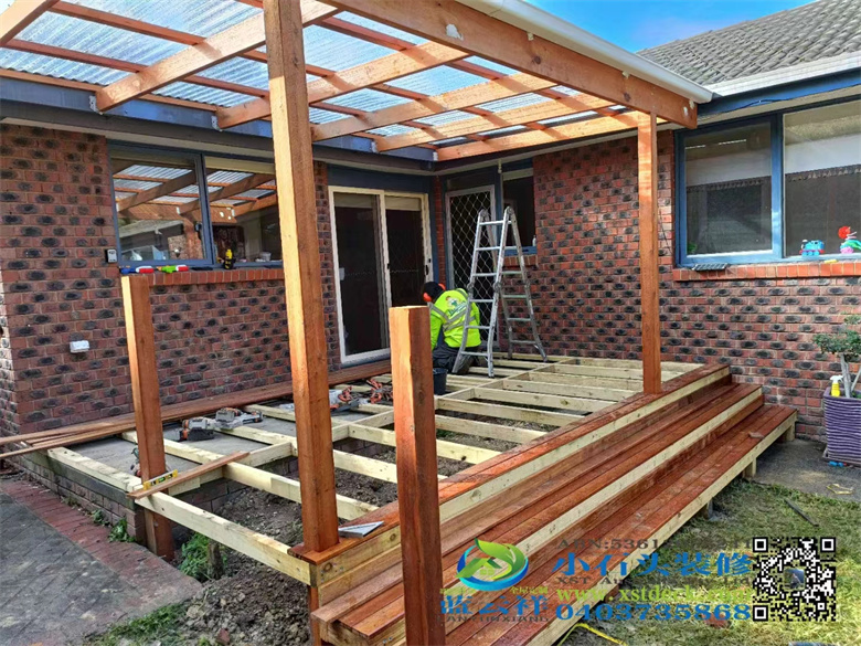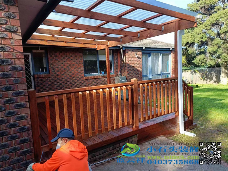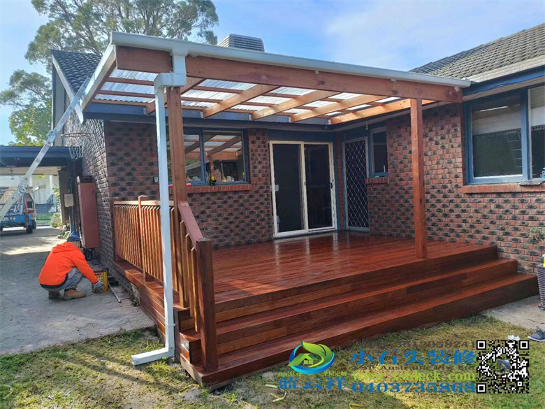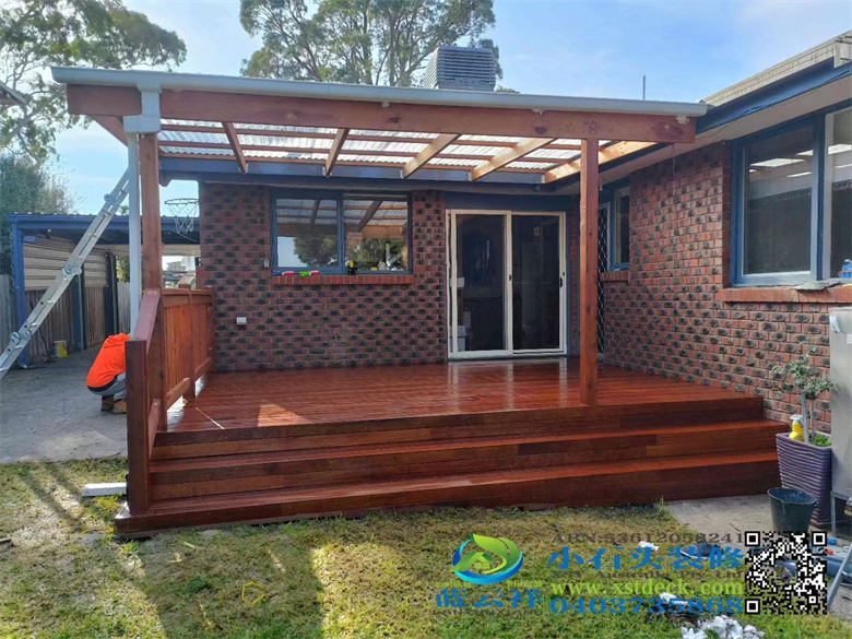 墨尔本户外实木凉棚雨棚地板,5.1m3.6m,merbau decking 90x19面板,整长开放台阶,每个板的间隔保持4mm左右,木结构护手围栏#墨尔本 #地板 #凉棚#雨棚 #户外实木地板#Merbau