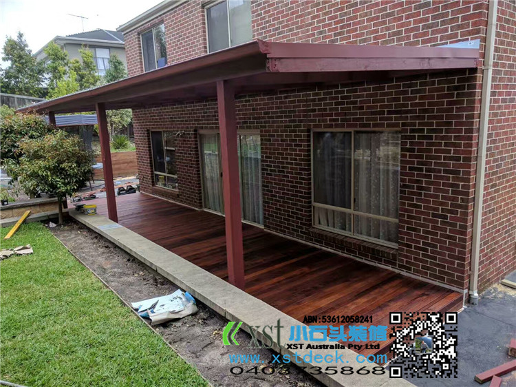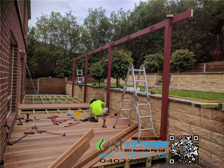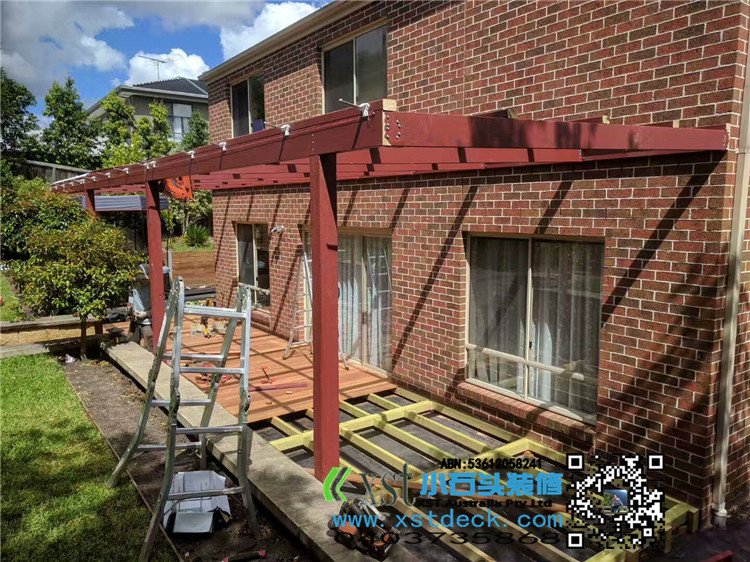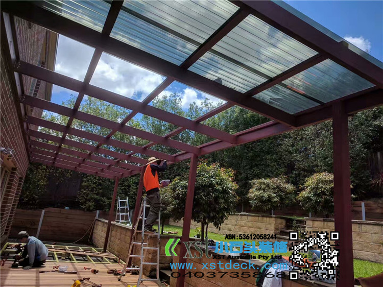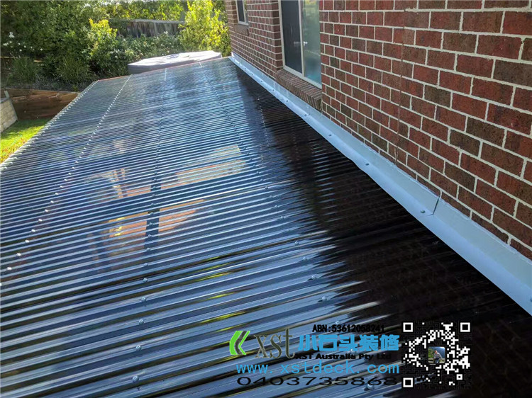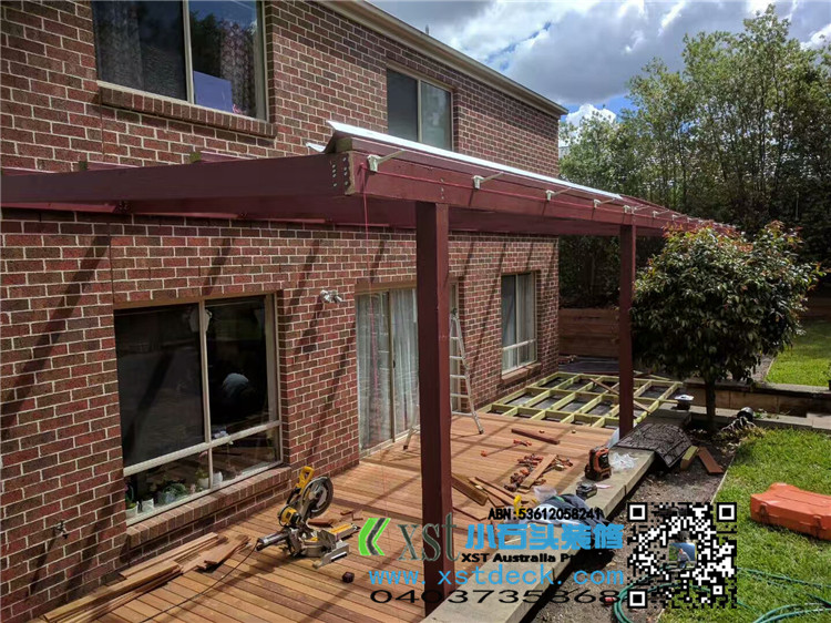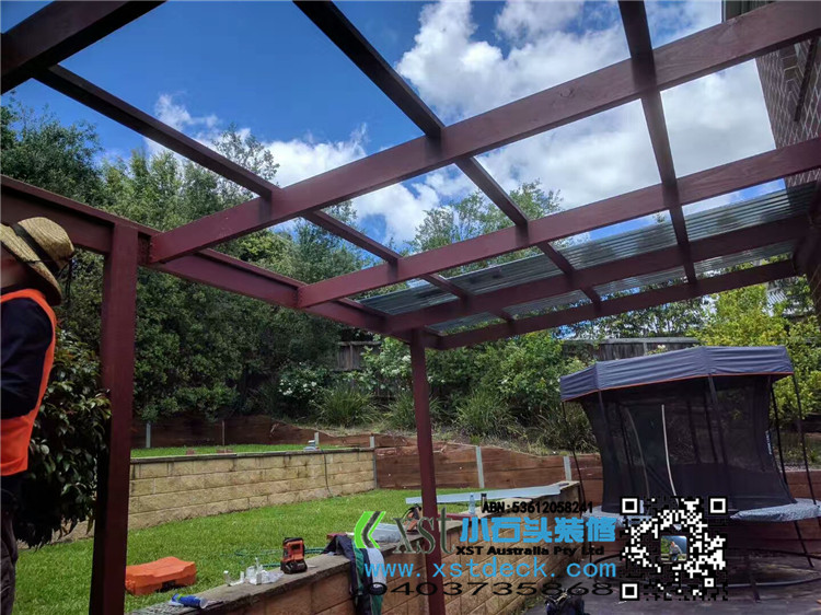 墨尔本 户外凉棚 雨棚 10.8mx3.4 pergola 三面包L型铁边 防漏水处理 红棕色油漆 黑色顶 水巢下水