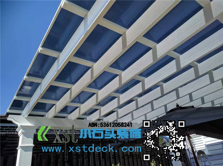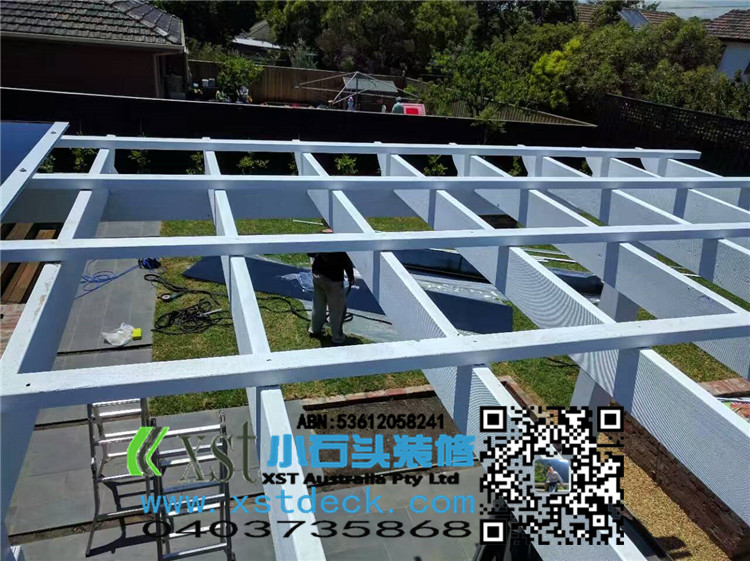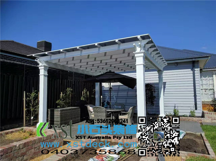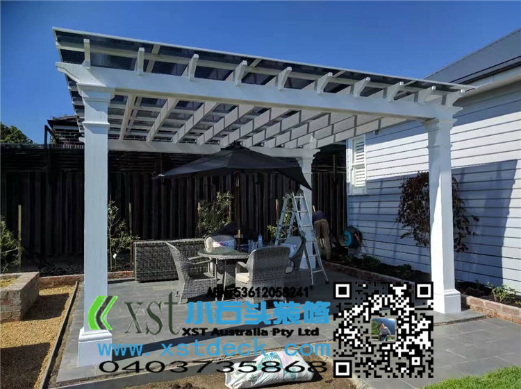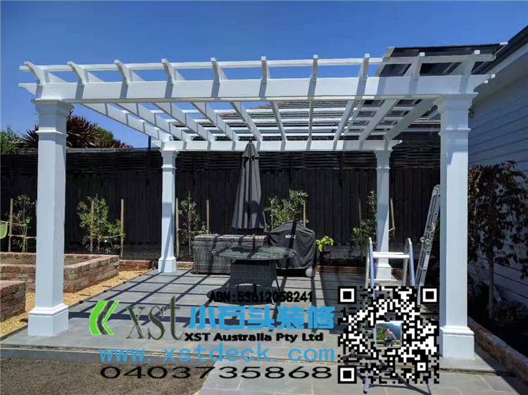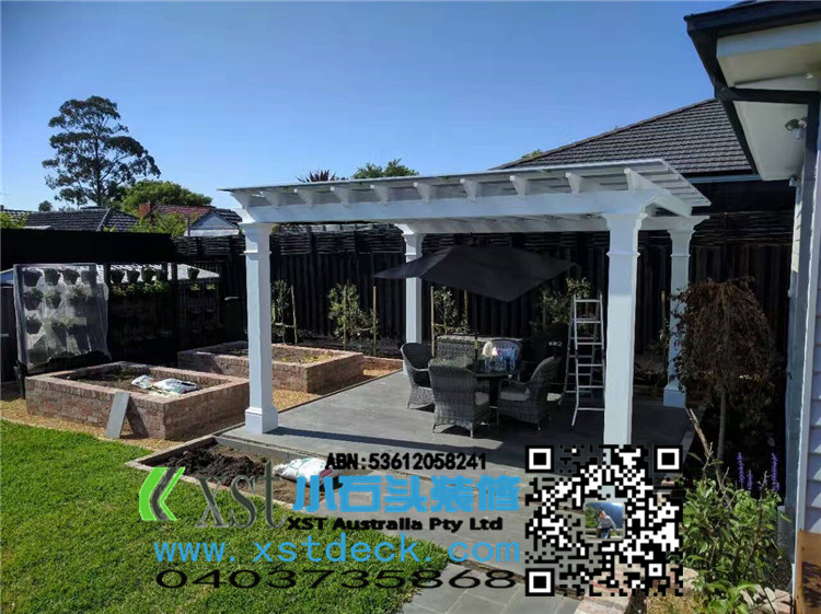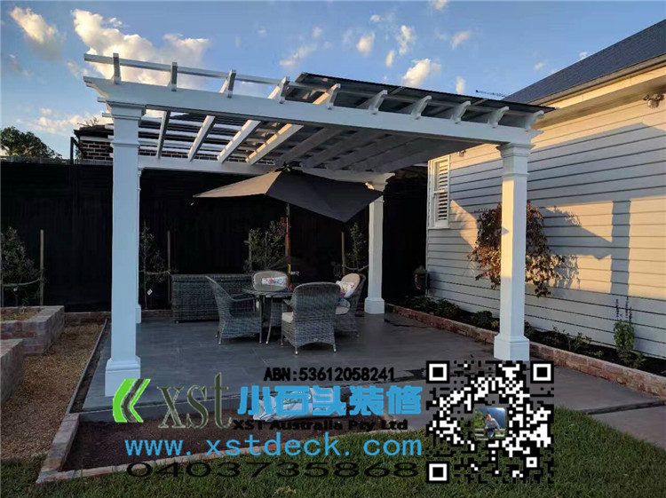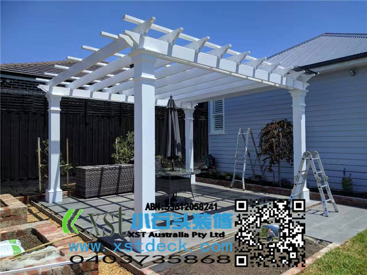 墨尔本 200MMX200MMpost pergola 中国风凉棚,全白色油漆,柱子包边造型。平顶挡光结构,大气,美观