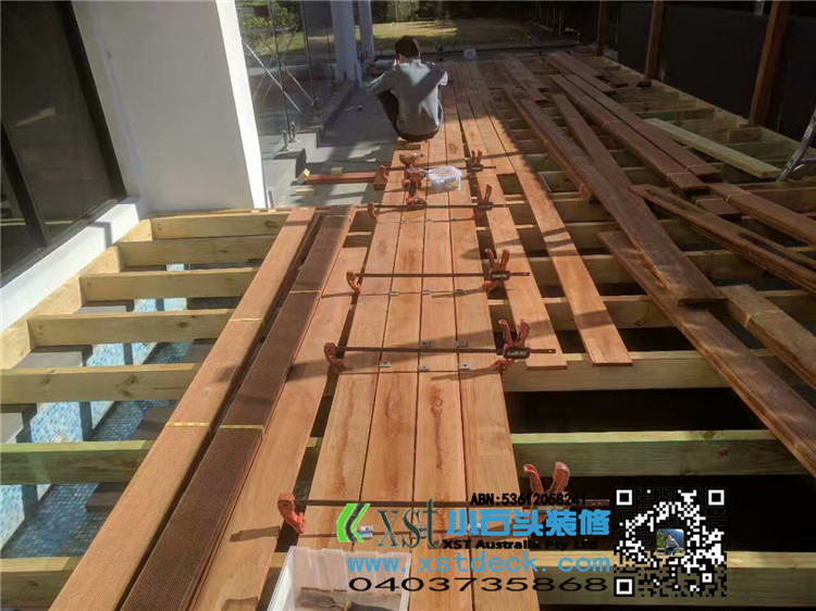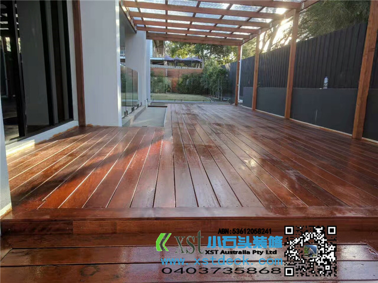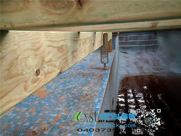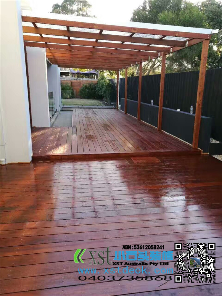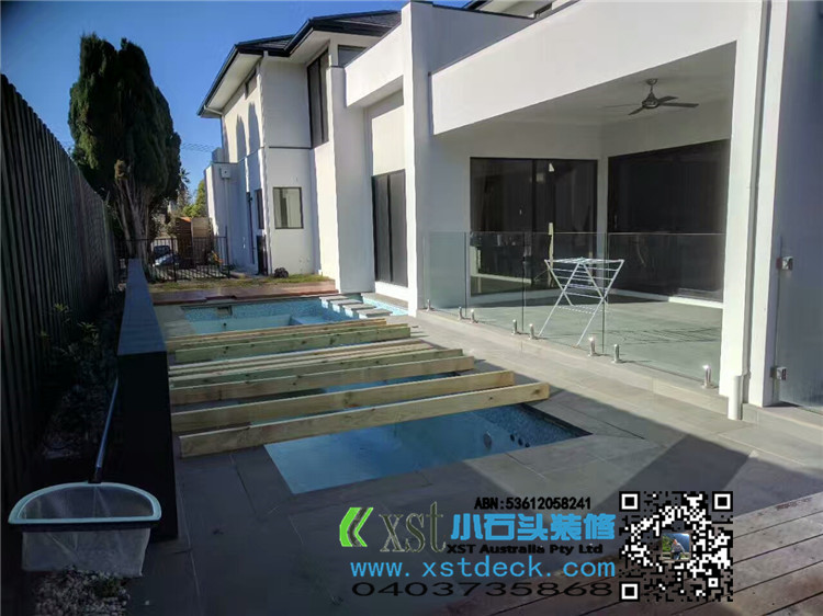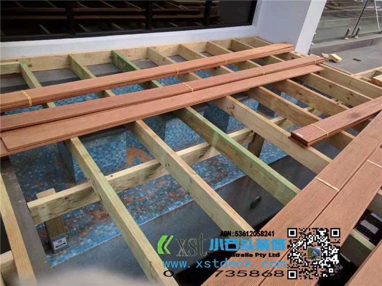 墨尔本 户外地板 140X19 merbau decking 游泳池盖板 龙骨140X45 treated pine 无底座 4面包边处理 11米长,我们保证一条直线,每个板缝隙5毫米左右。