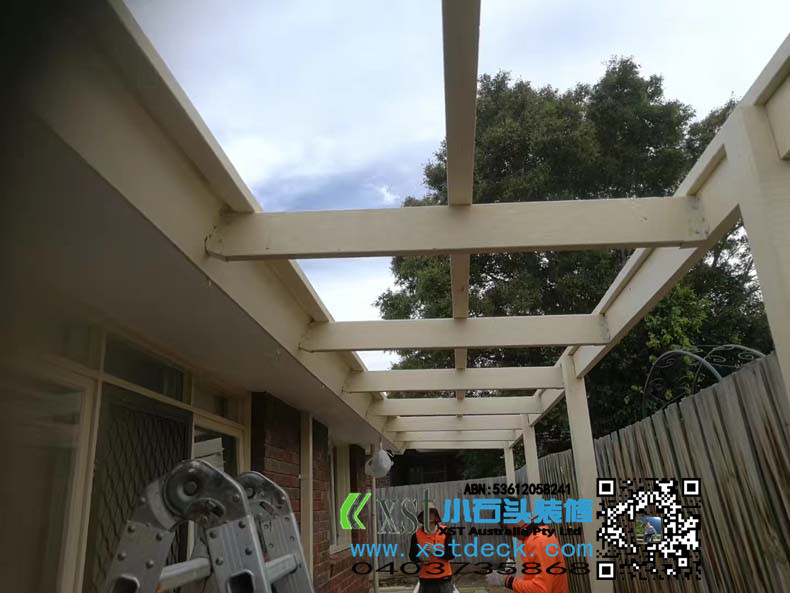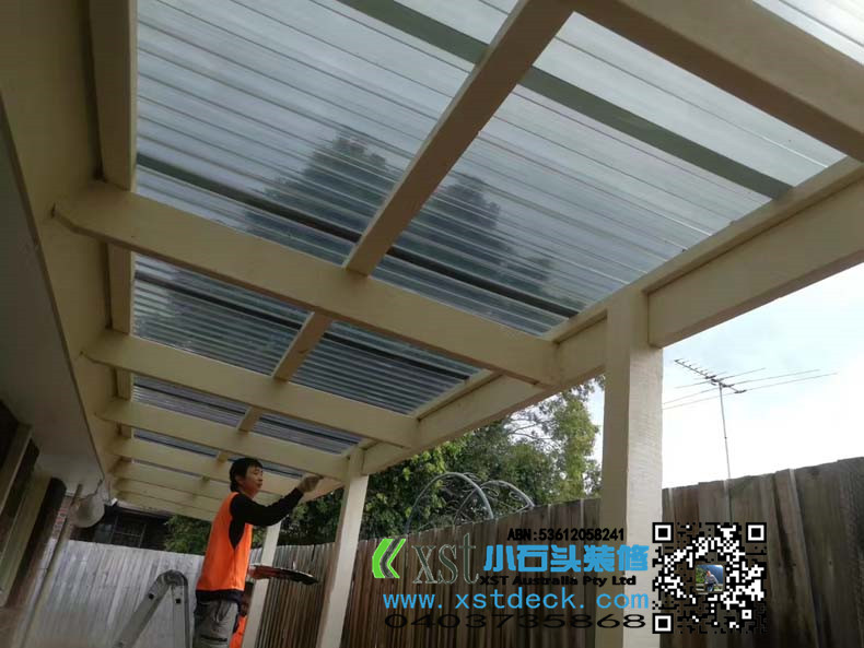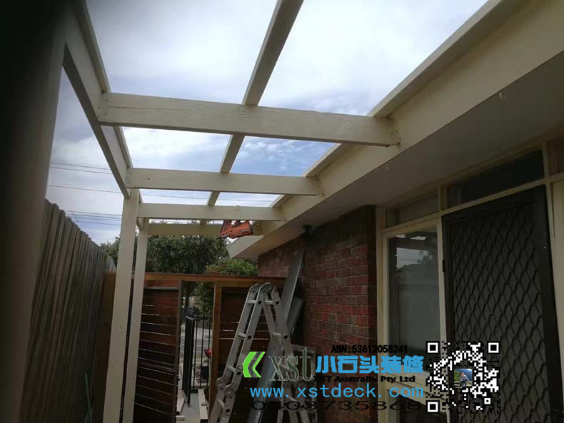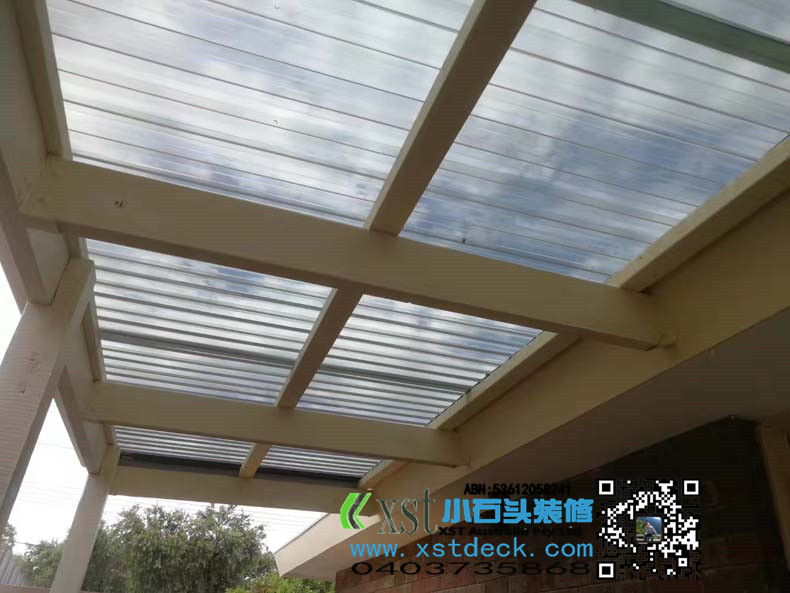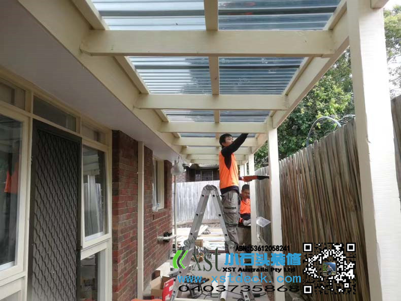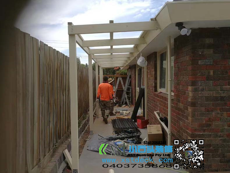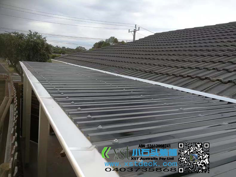 澳大利亚墨尔本户外凉棚,雨棚,2.4m*11m,白色油漆,三面包铁,防漏雨,青黑色顶。