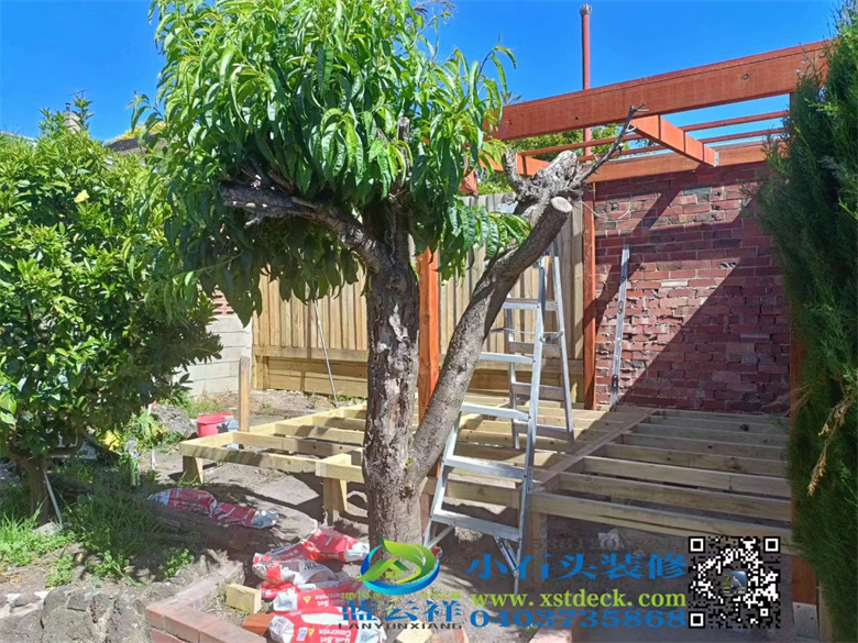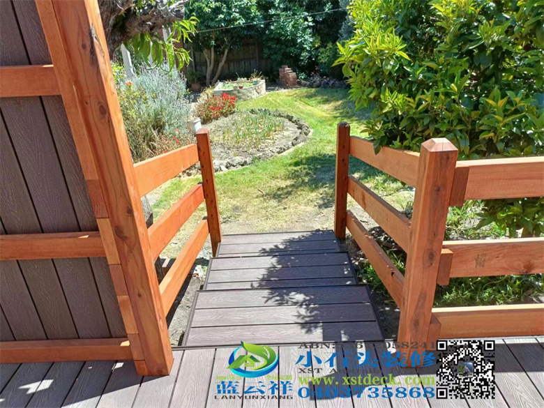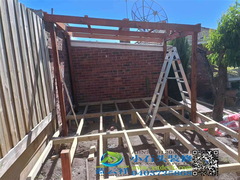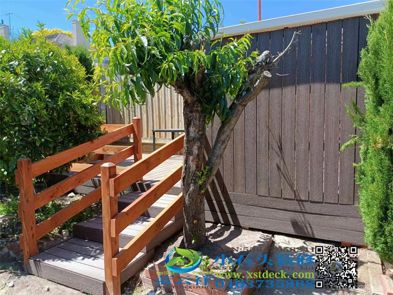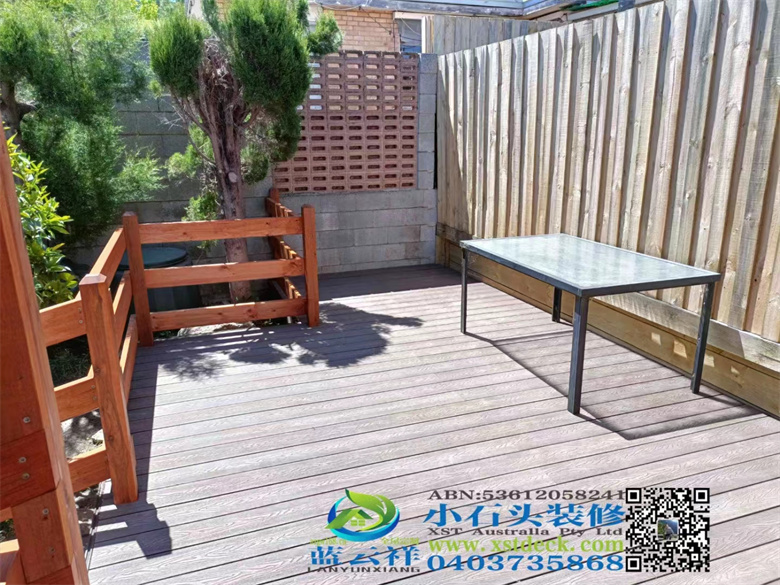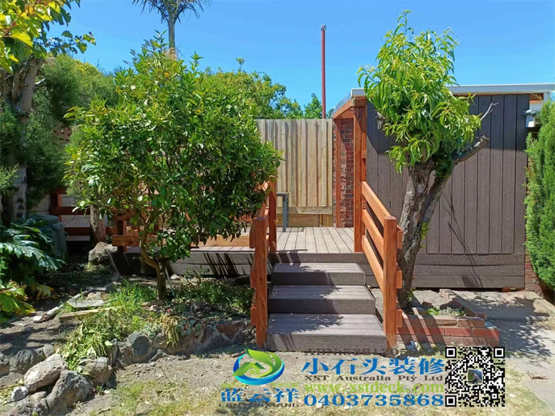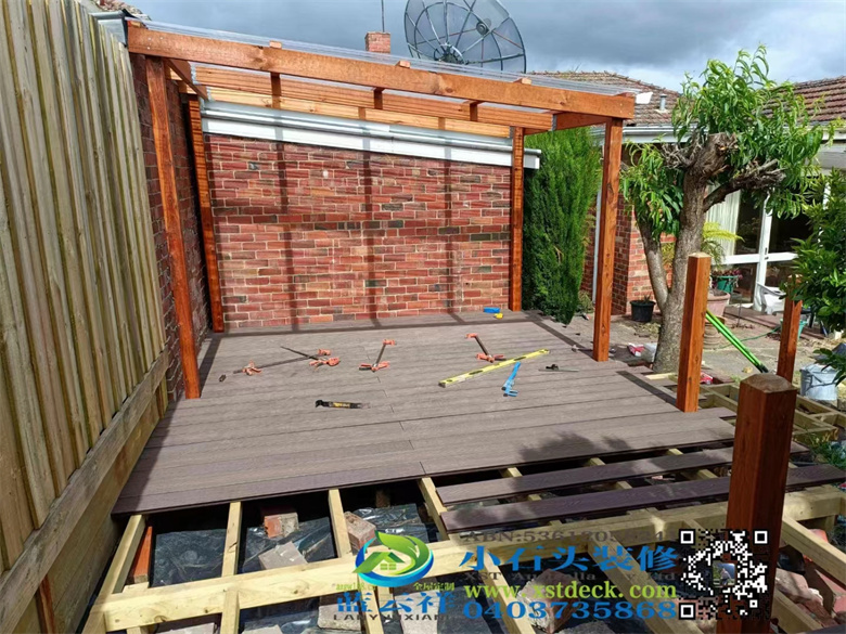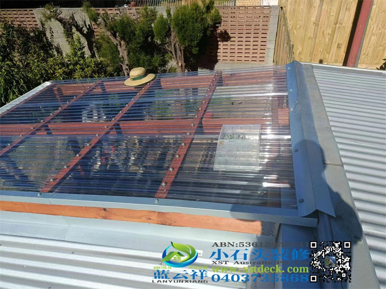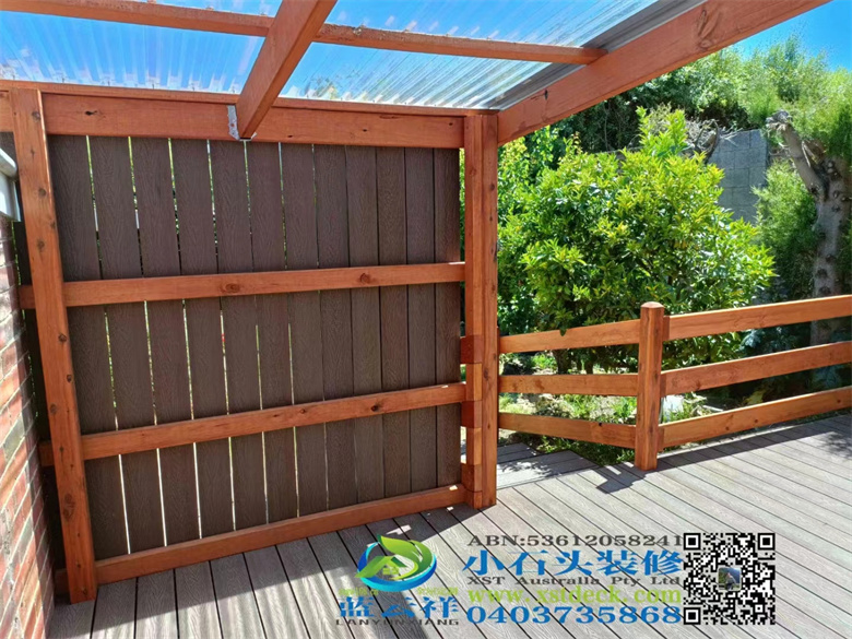 墨尔本后院户外地板小庭院改造 140x22塑木地板,透明顶小凉棚。