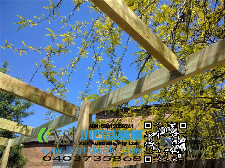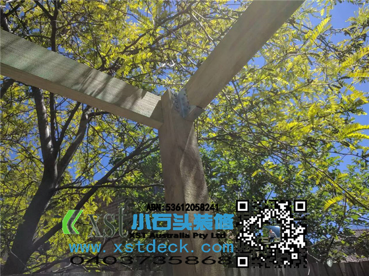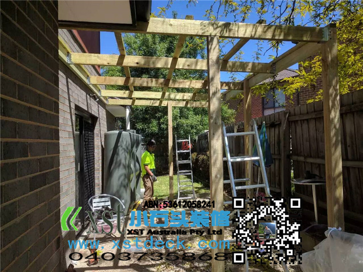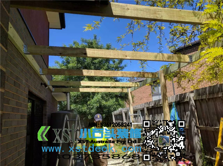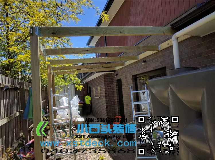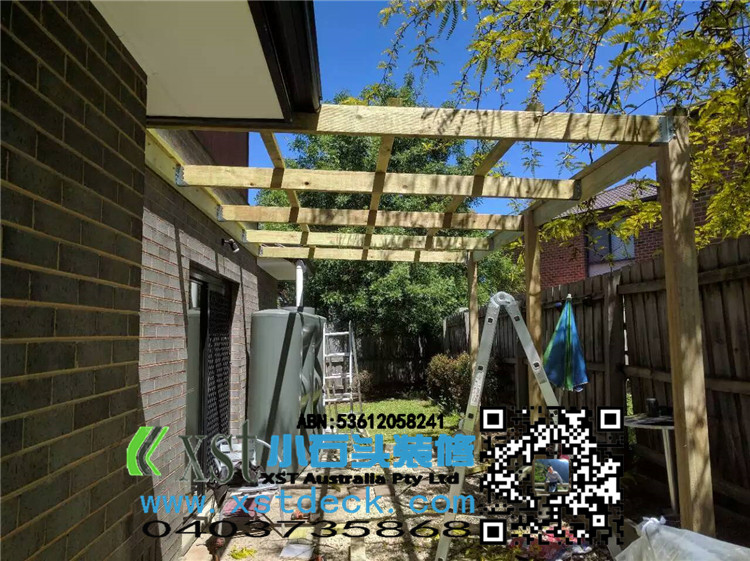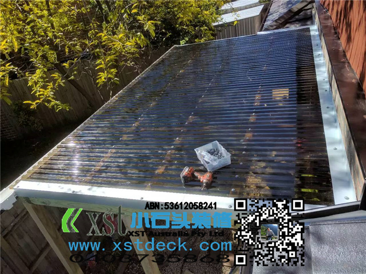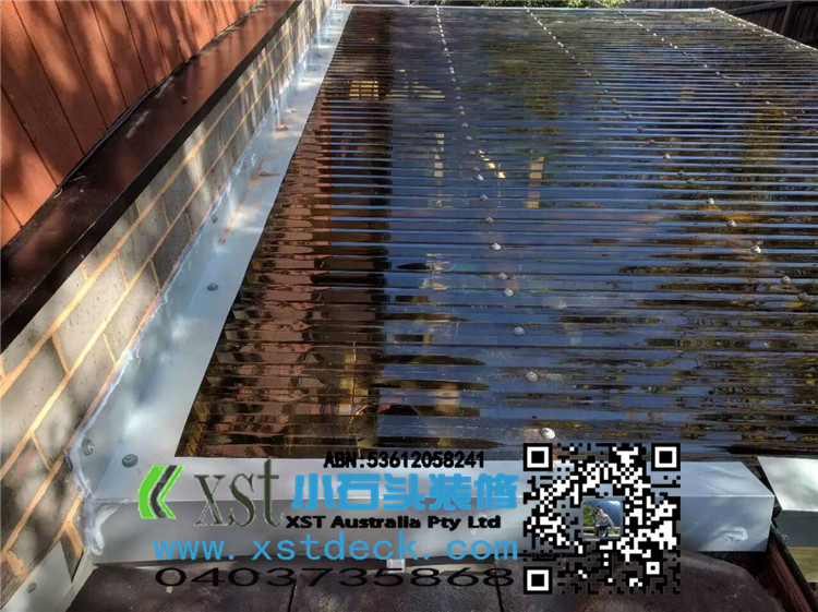墨尔本 pergola 15平方凉棚 三面L型铁皮包边,防漏水处理,水槽进收水系统。