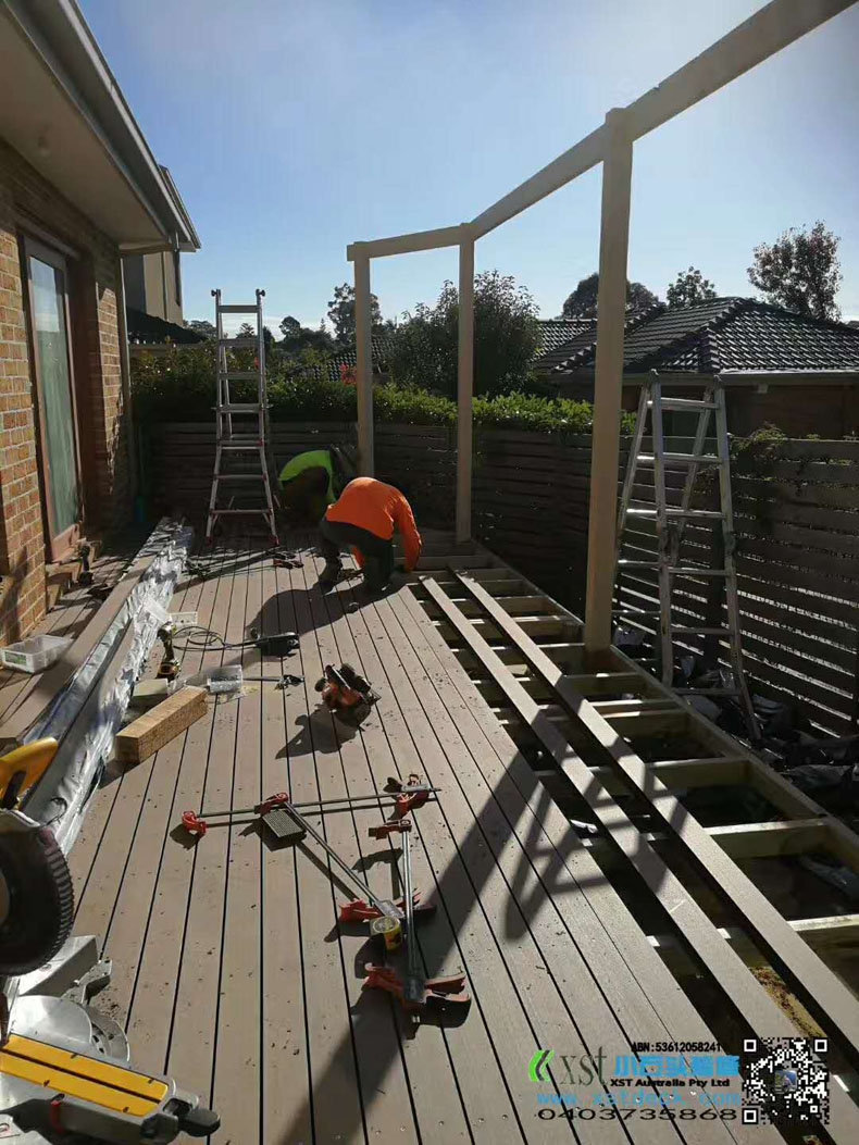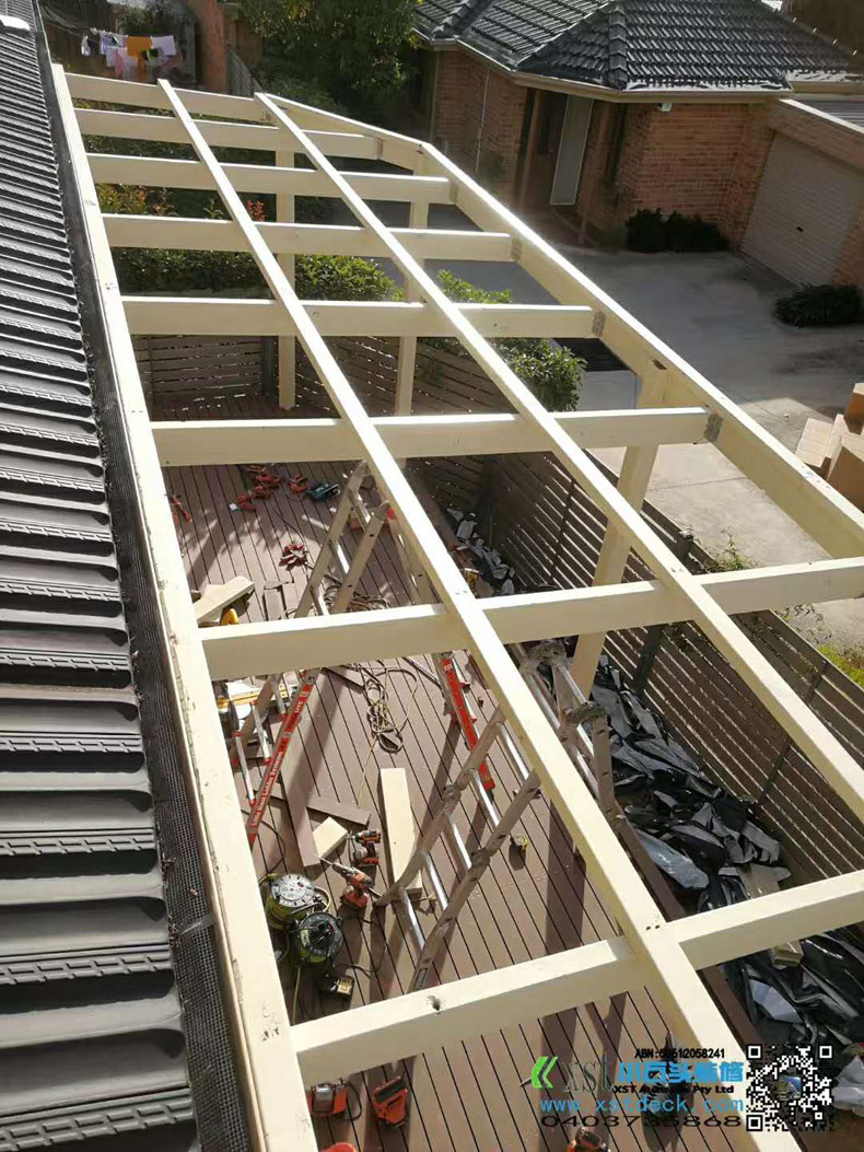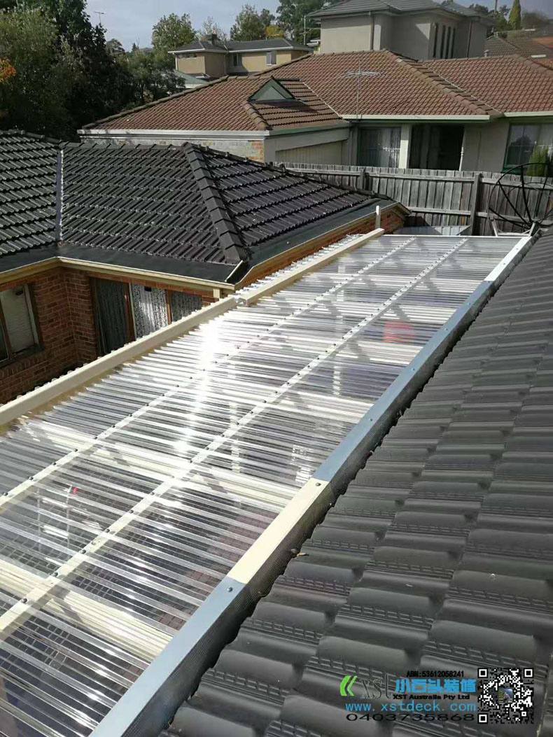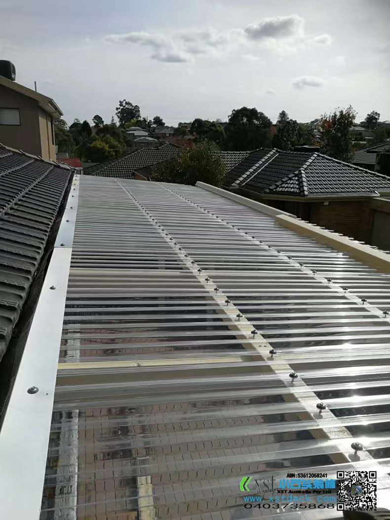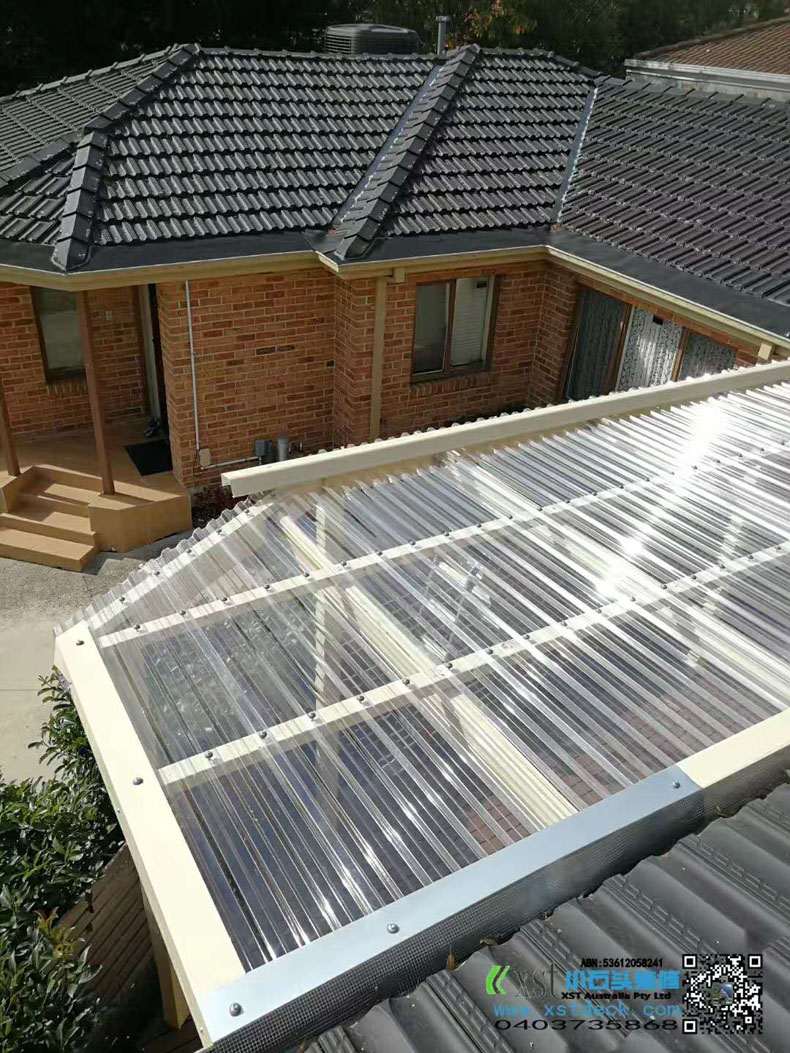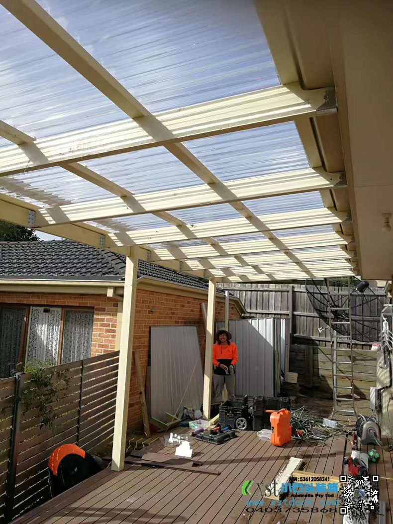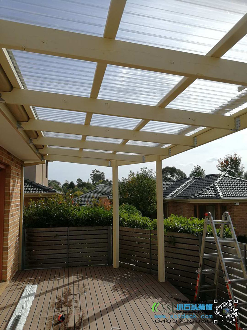 澳大利亚墨尔本 户外凉棚 雨棚 pergola 3m*8m 米黄色油漆,透明顶,三面包铁