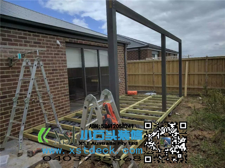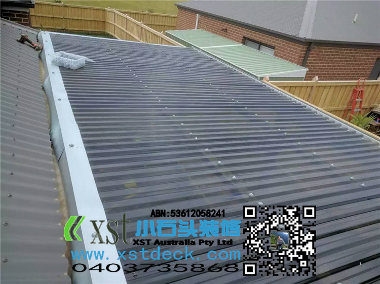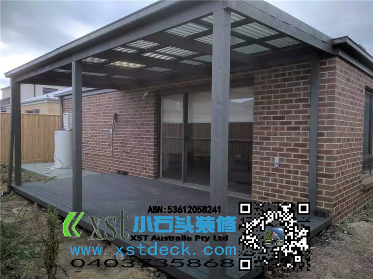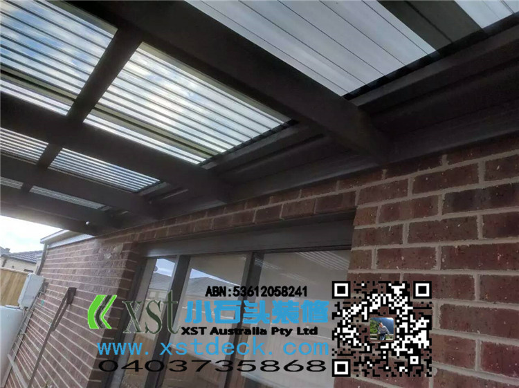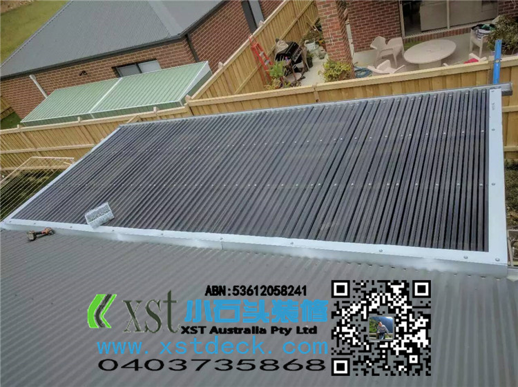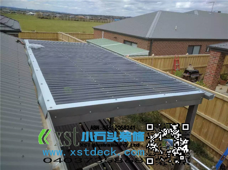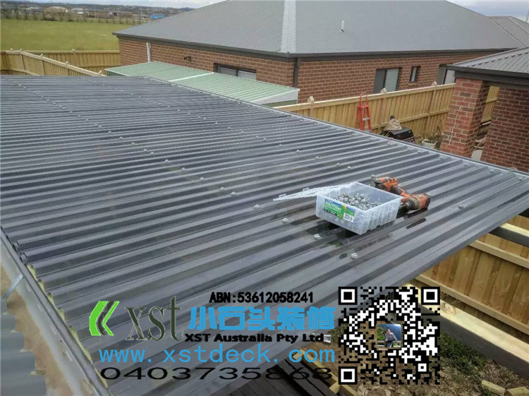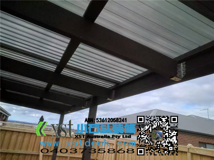 墨尔本 pergola后院15平方凉棚 黑色油漆 三面L型铁片包边 防漏水处理 水巢