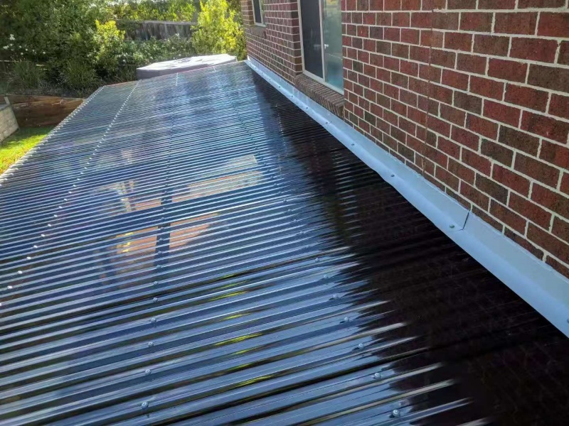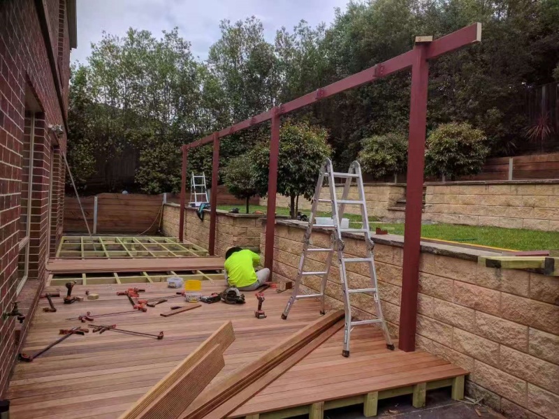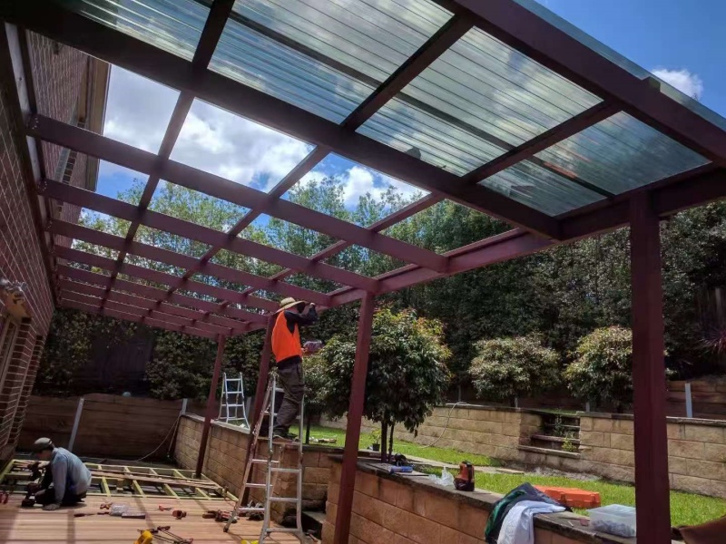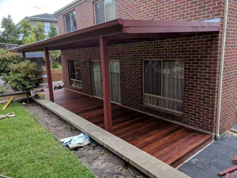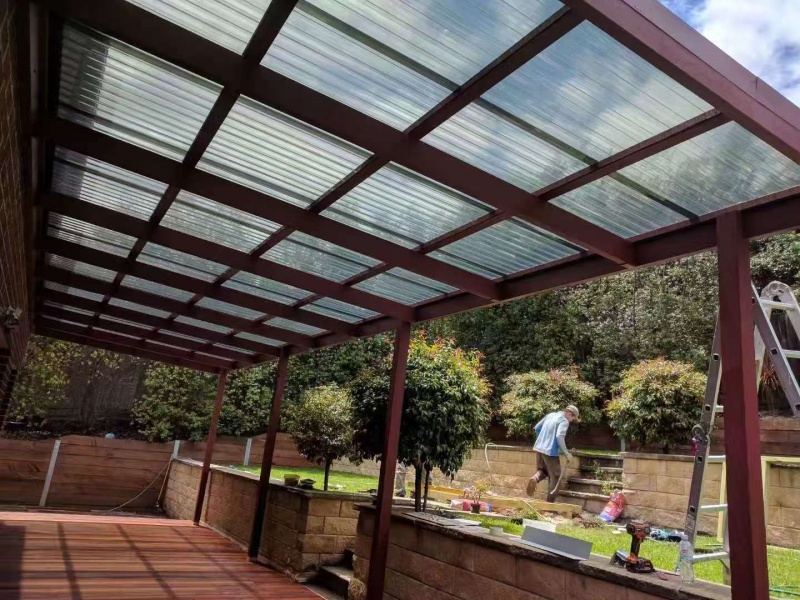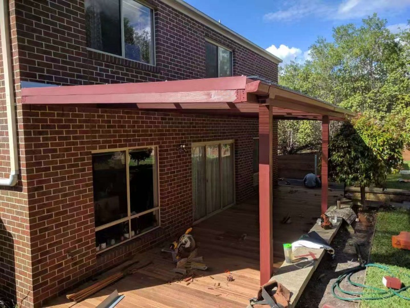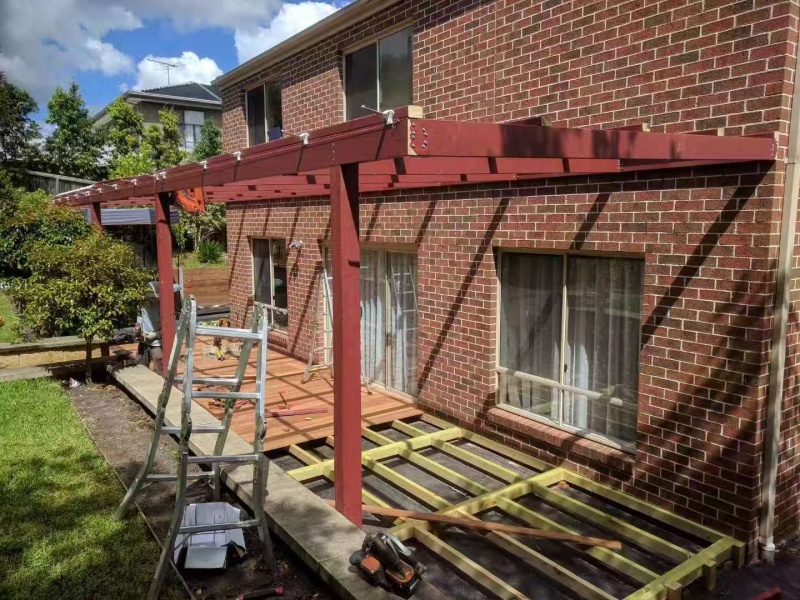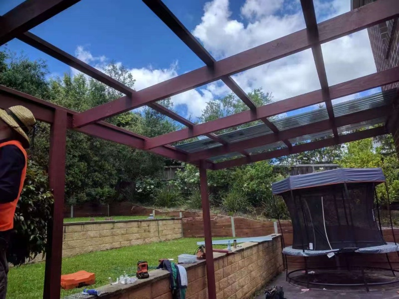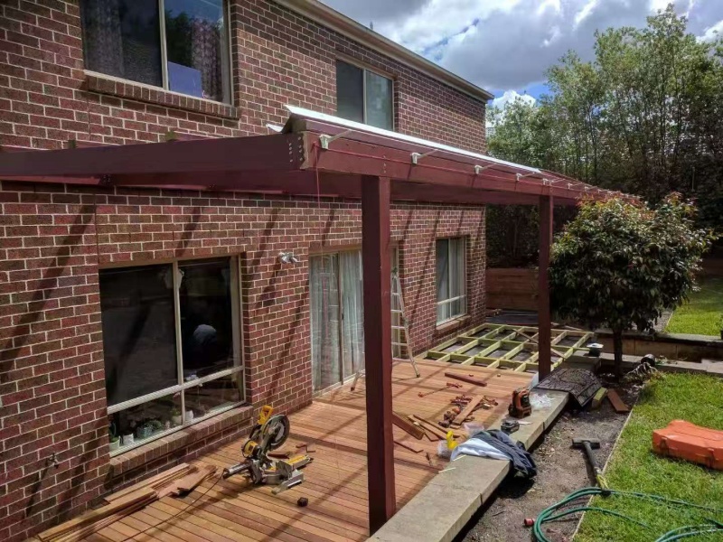 墨尔本户外凉棚雨棚10.8m3.4pergola三面包L型铁板,防漏水处理红棕色油漆。