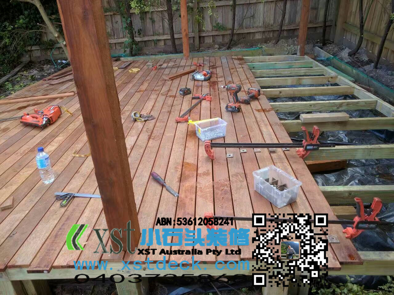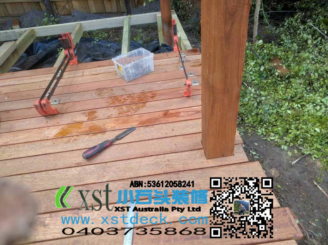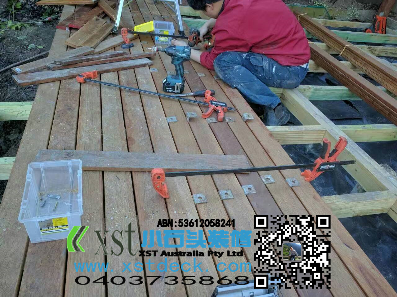 墨尔本decking18平米户外地板decking小楼梯,不锈钢螺栓,每张decking板缝隙都有专业的夹子夹出来,保证5毫米左右。
