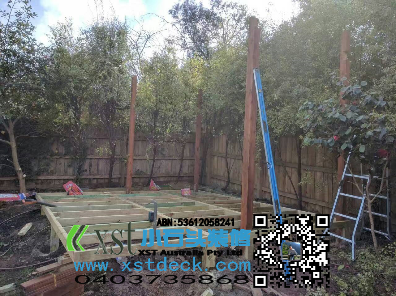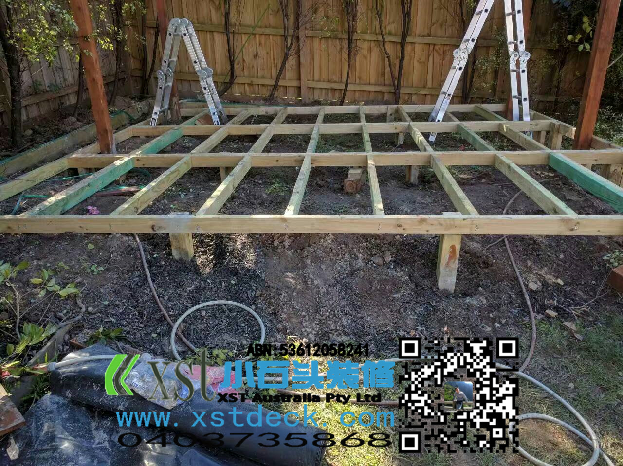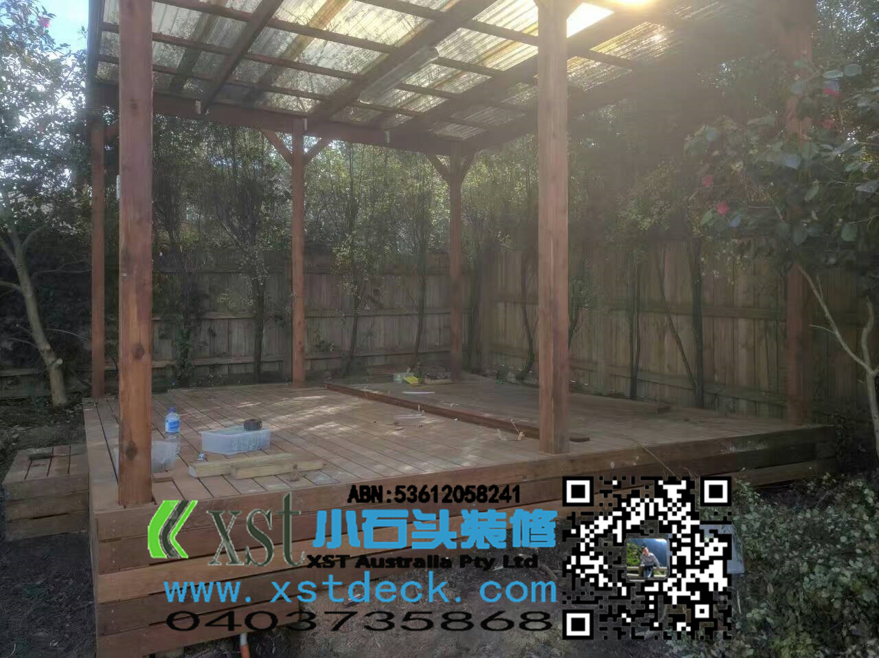 墨尔本decking18平米户外地板decking小楼梯,不锈钢螺栓,每张decking板缝隙都有专业的夹子夹出来,保证5毫米左右。