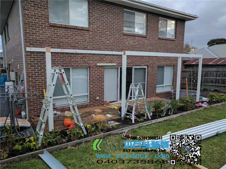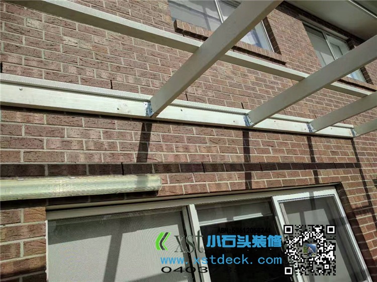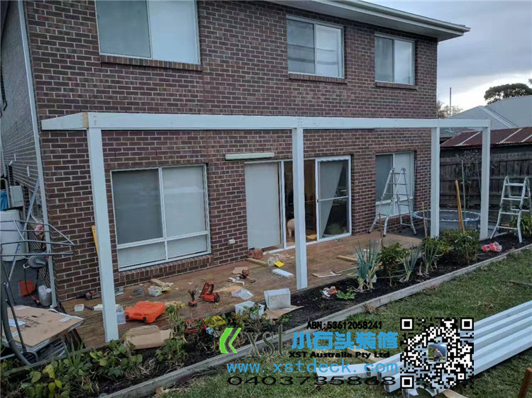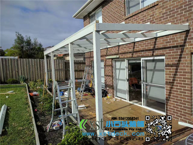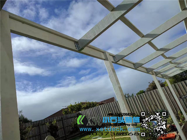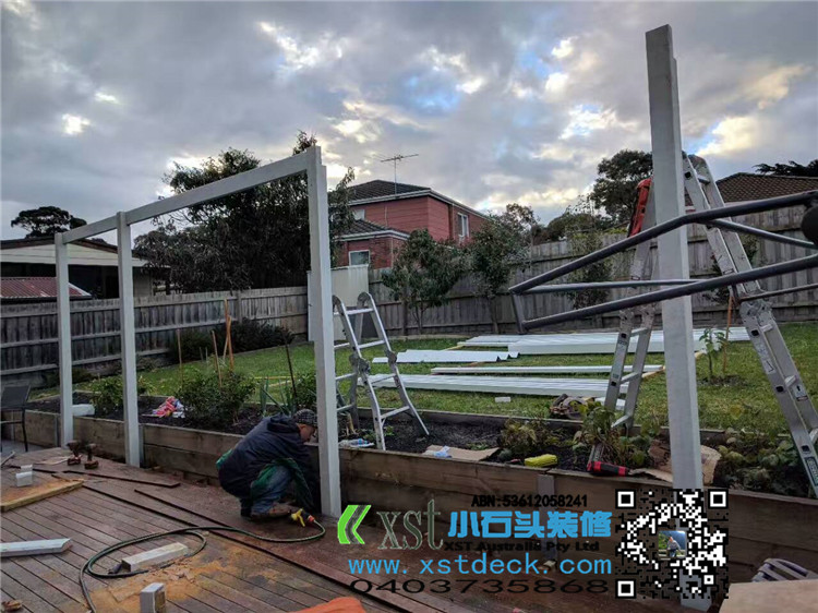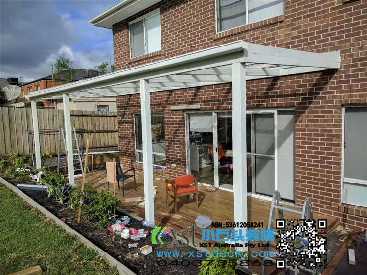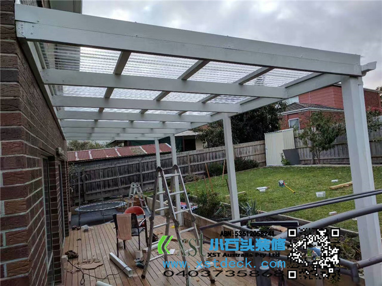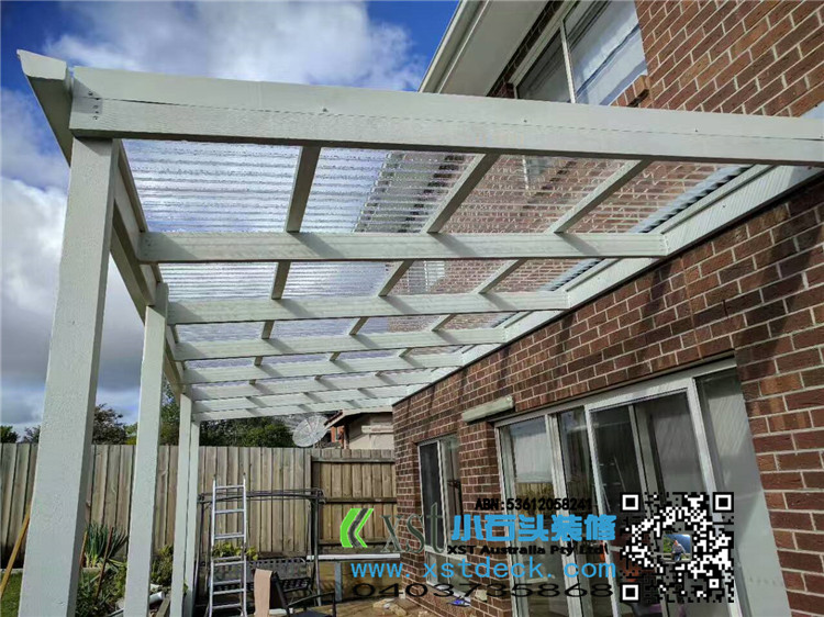 墨尔本 凉棚 凉亭3x7.8m pergola 透明顶 乳白色漆 水槽下水 三面铁皮包边。。