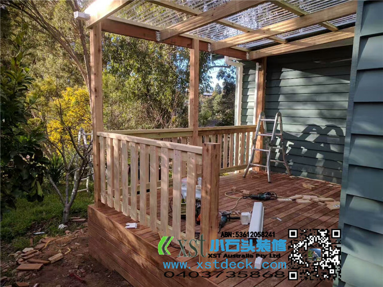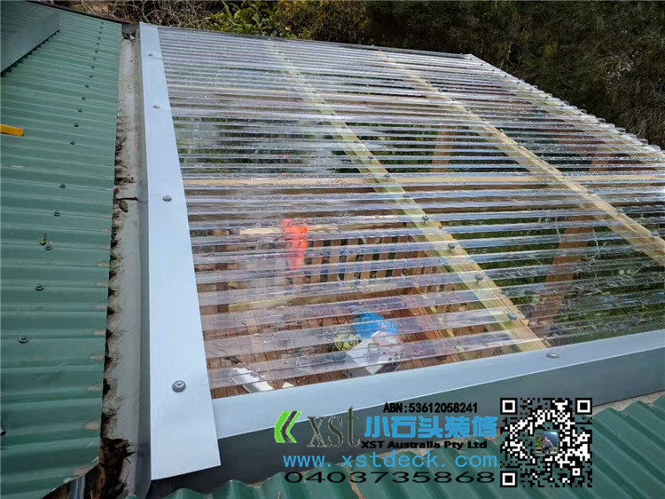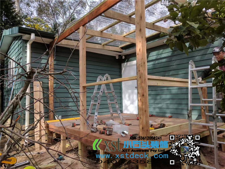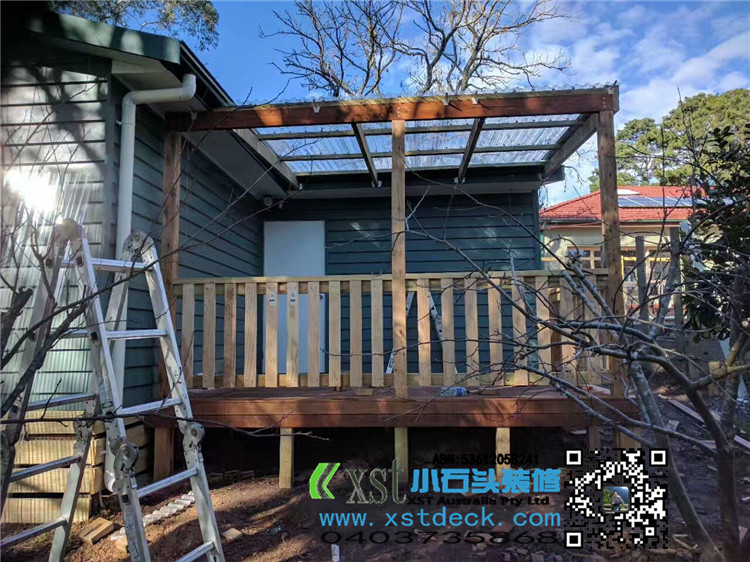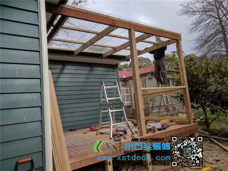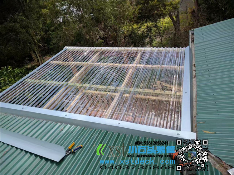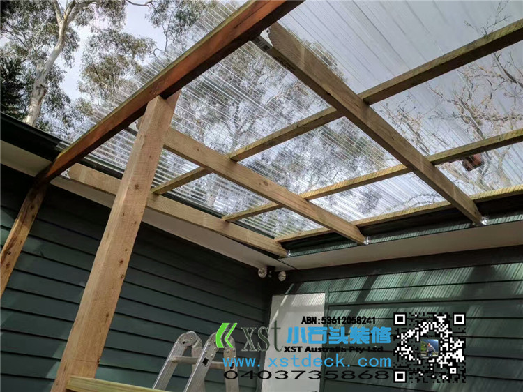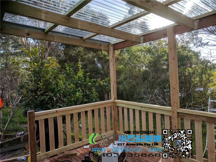 墨尔本 凉棚 雨棚 perglola 3X3.8m 透明塑料顶 三面L型铁片包边还漏水处理 水巢 90X19竖条围栏扶手