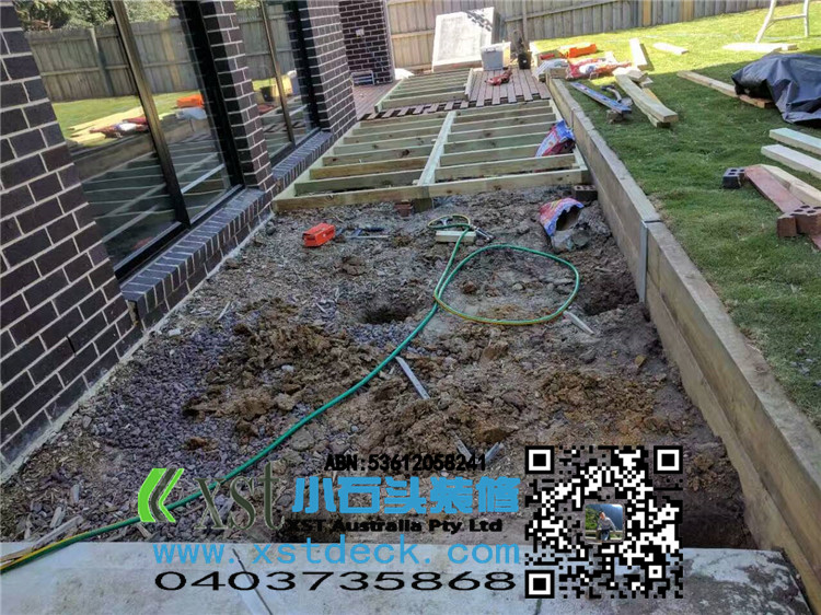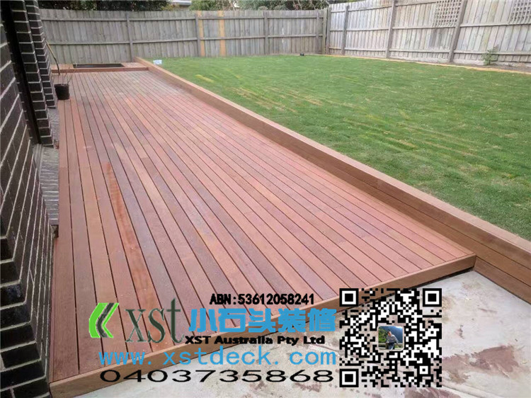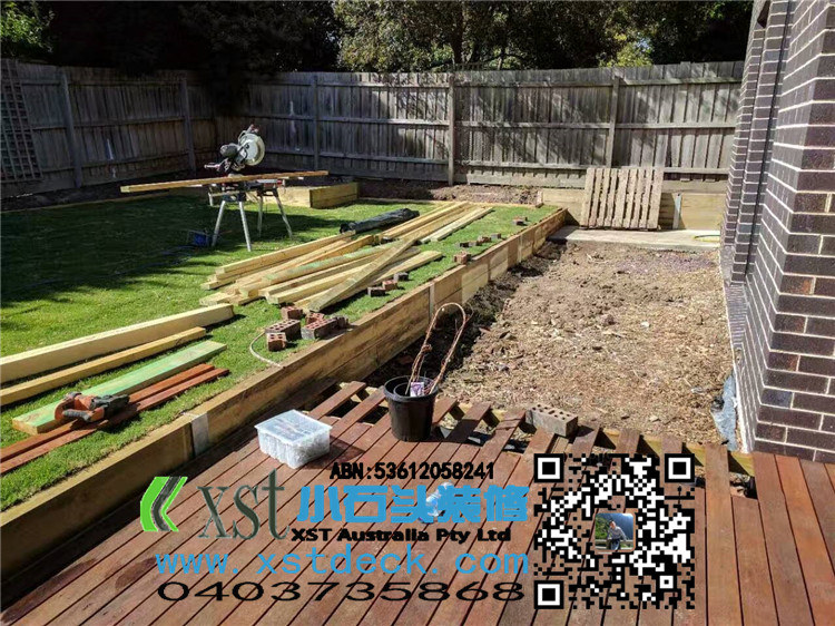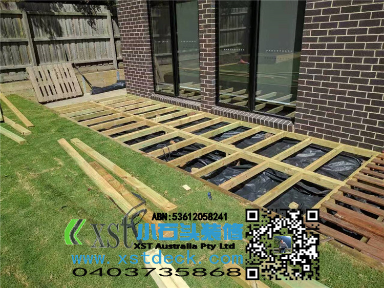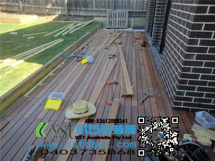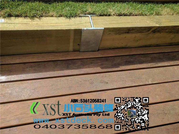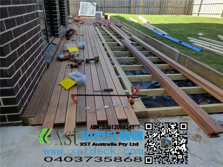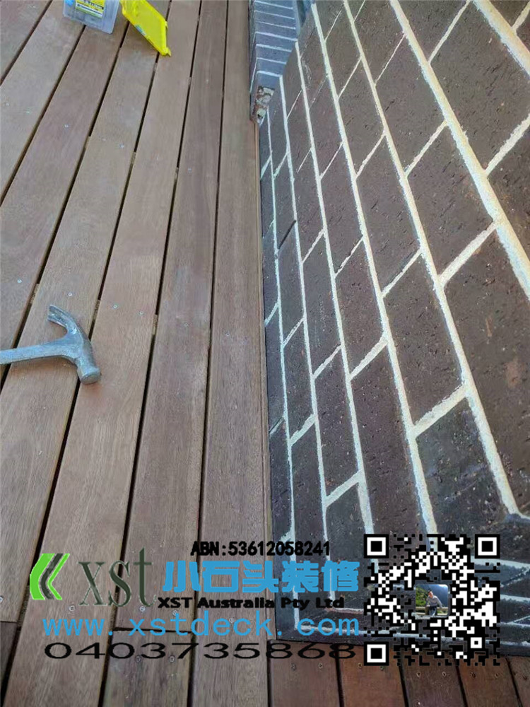 墨尔本 merbau 16平方户外地板扩展 防草处理,每个板缝隙我保持5毫米左右,不锈钢锁板